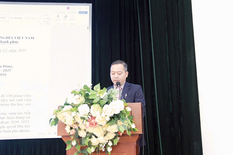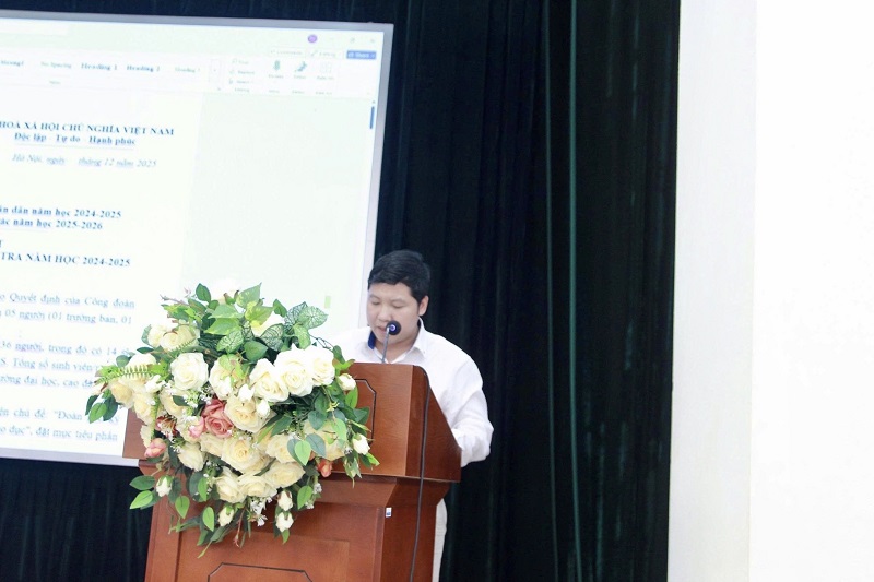 Tại Hội nghị, TS. Nguyễn Mạnh Toàn đã trình bày báo cáo kiểm điểm việc thực hiện đường lối, chủ trương của Đảng, chính sách pháp luật của Nhà nước và các quy định của Nhà trường trong năm học 2024 – 2025 và mục tiêu, nhiệm vụ trọng tâm năm học 2025 – 2026.