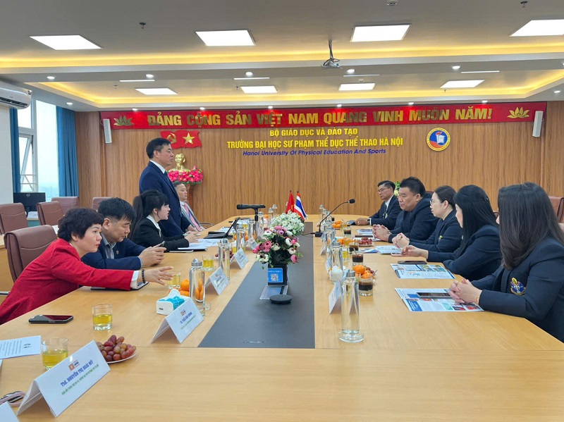 Phát biểu tại buổi làm việc, PGS.TS Nguyễn Duy Quyết – Hiệu trưởng Nhà trường bày tỏ niềm vui được đón tiếp đoàn đại biểu Thái Lan, đồng thời khẳng định hợp tác quốc tế là định hướng chiến lược quan trọng nhằm nâng cao chất lượng đào tạo và hội nhập của Trường. Đại diện phía Thái Lan, Ông Narin Sangrichan gửi lời cảm ơn về sự đón tiếp trọng thị và mong muốn hai bên tiếp tục mở rộng hợp tác trong các lĩnh vực đào tạo, nghiên cứu khoa học và hoạt động giao lưu thể thao.